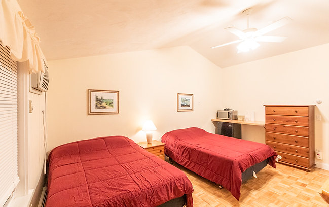 Suites B, C, D, E, F, and I in the Muddy Cove Retreat Center have one room and a full bathroom. There are two full size (double) beds and small dining area.